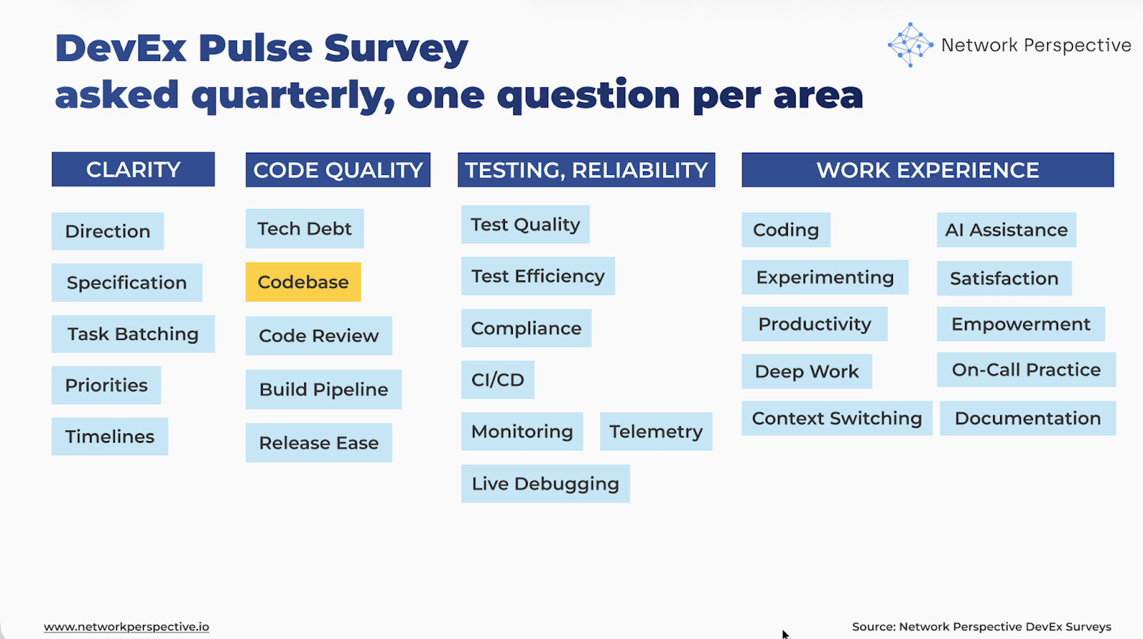 In our DevEx AI tool, we use two sets of survey questions: DevEx Pulse (one question per area to track overall delivery performance) and DevEx Deep Dive (a focused root-cause diagnostic when something needs attention).